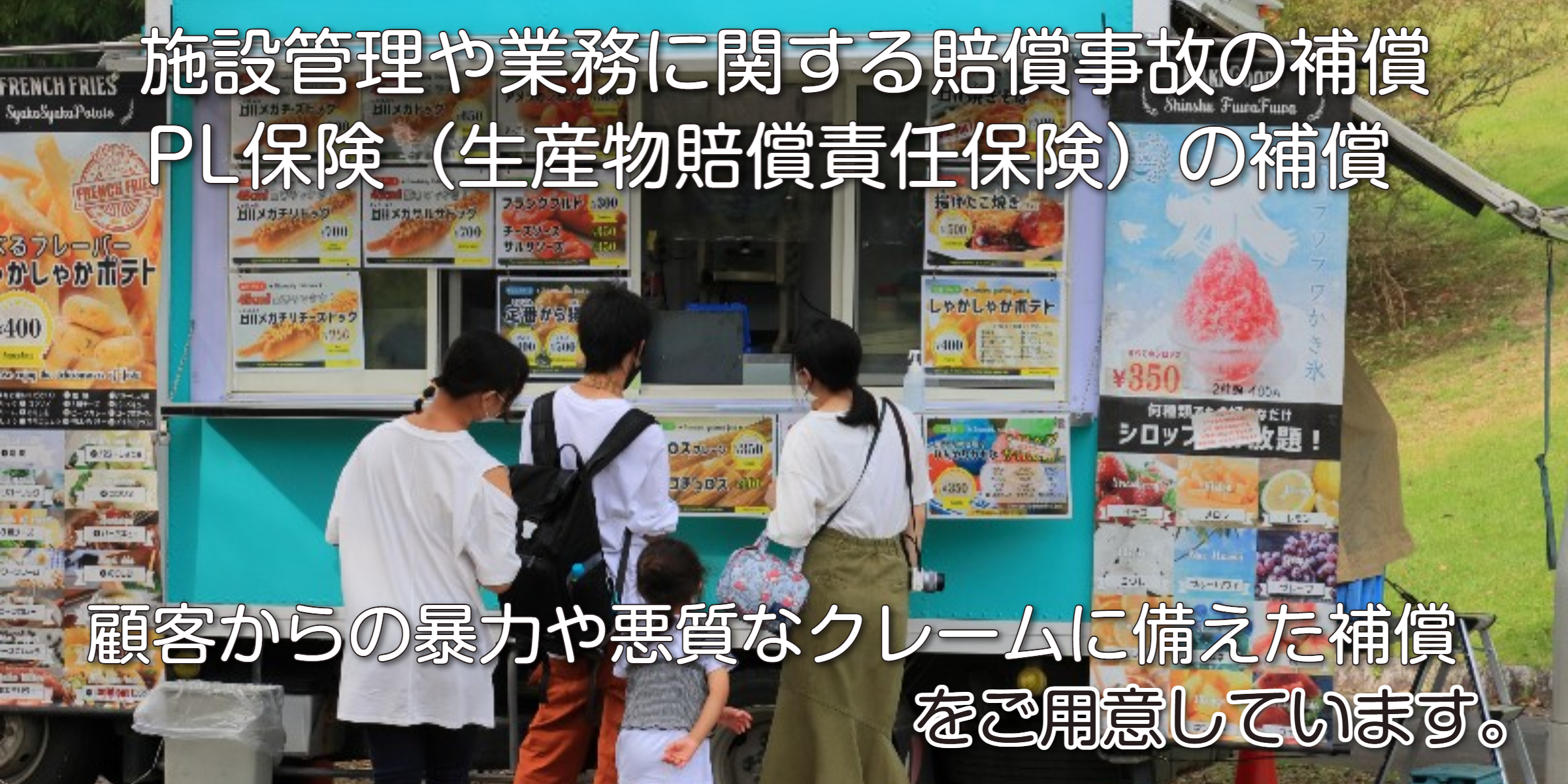 今は必要ないお客さまも、将来急に必要になった際に役立つサービスです。「急にイベント出店が決まった」「建設現場から言われていたのを忘れていた」「保険証券が見当たらない」そんな時も、私たちにご連絡いただければ、あなたのビジネスを止めません。 お急ぎの場合は、すぐにお電話ください。
