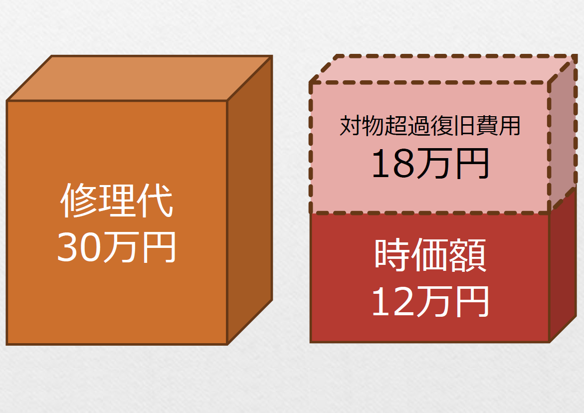 足場の解体作業中、誤って鉄パイプを落としてしまい、隣に止めてあったお隣さんの車(年式の古い車)の屋根を凹ませてしまった。修理工場で見積もると修理費は30万円だったが、年式が古いため車の時価額(事故時点での価格)は12万円と判定されてしまったというケース。